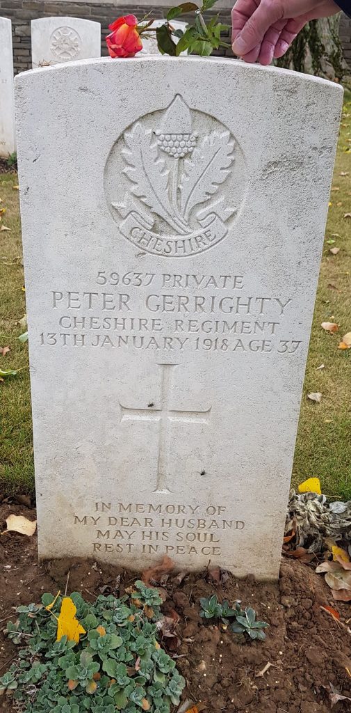 13/01/1918 Private Peter Gerrighty (Age 43) 10th Bn. Favreuil British Cemetery, France. ‘59637’ II. D. 39. Son of the late Mr. and Mrs. James Gerrighty; husband of Ann Gerrighty, of 8, Davies Court, Steam Mill St., Chester. (pic from findagrave.com – with thanks)