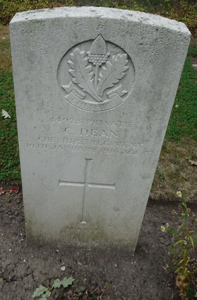 19/01/1916 Private Charles Dean (Age 37) 11th Bn. Rifle House Cemetery, Belgium. ‘14928’ IV. G. 11. Son of John and Dinah Dean; husband of Elizabeth Ellen Dean, of 54, Ledward St., Winsford, Cheshire.