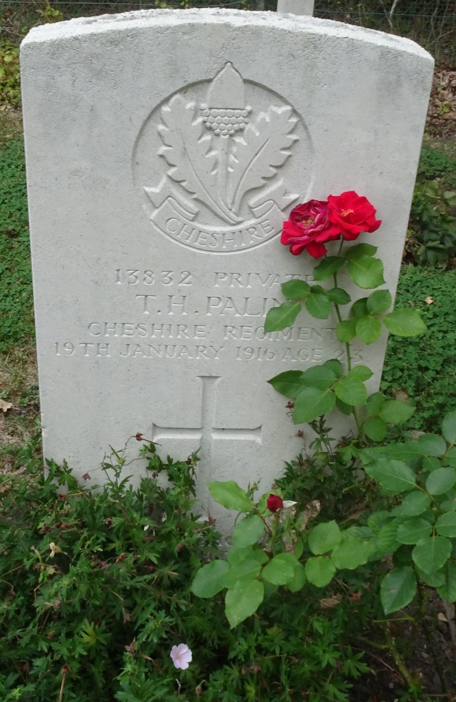 19/01/1916 Private Thomas Henry Palin (Age 23) “B” Coy. 11th Bn. Rifle House Cemetery, Belgium. ‘13832’ IV. G. 12. Son of the late Thomas and Annie Palin, of Crewe.