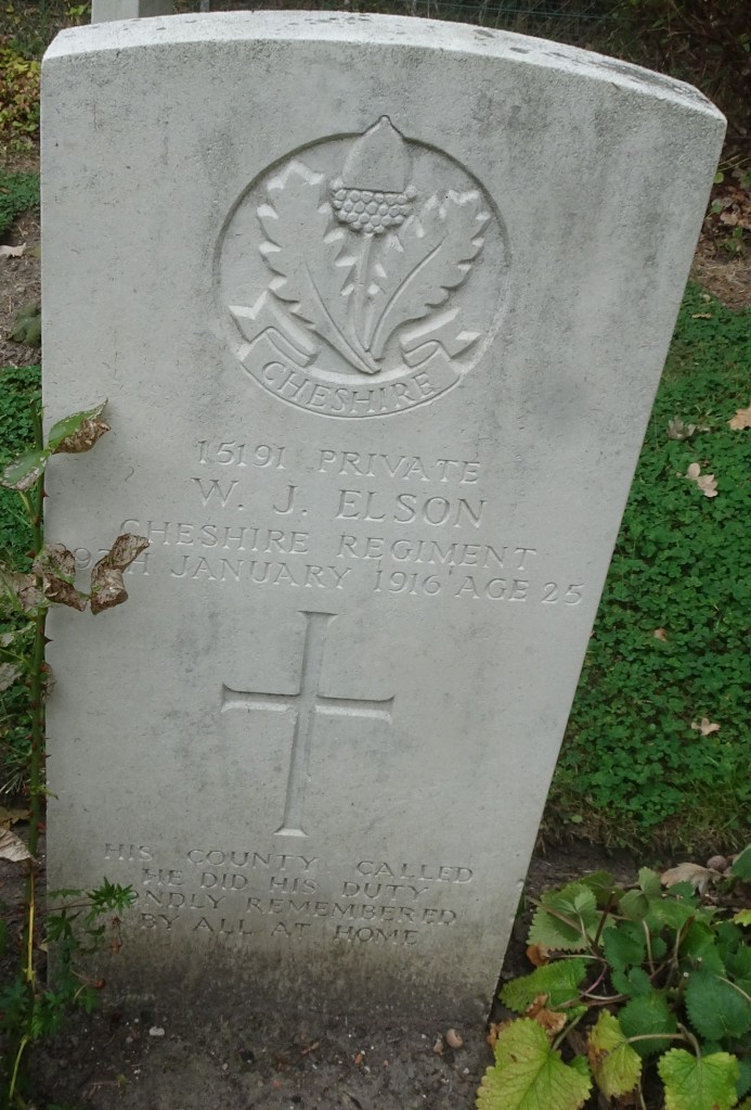 19/01/1916 Private William John Elson (Age 25) 11th Bn. Rifle House Cemetery, Belgium. ‘15191’ IV. G. 13. Son of Mrs. Alice Elson, of 8, Peter St., Crewe.