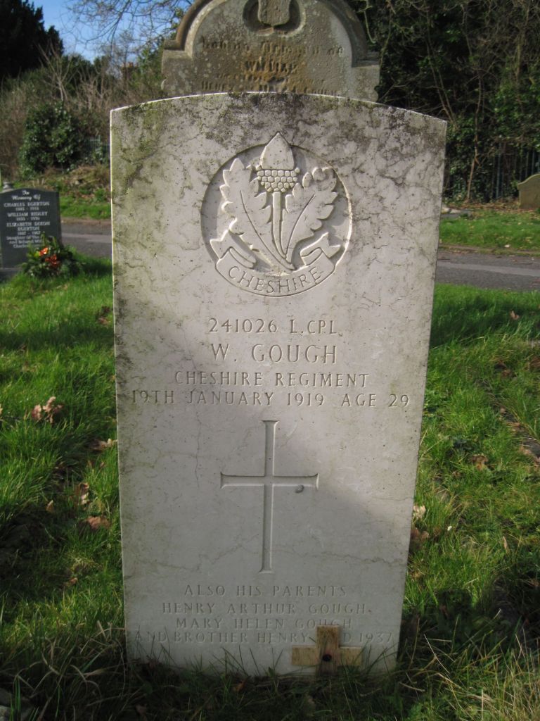 19/01/1919 Lance Corporal William Gough (Age 29) 1st/5th Bn. Chester (Overleigh) Cemetery, United Kingdom. ‘241026’ 4370. Son of Henry and Mary Ellen Gough, of 41, West St., Newton, Chester.