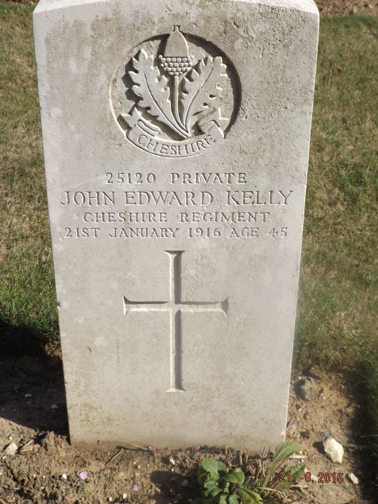 21/01/1916 Private John Edward Kelly (Age 45) 1st Bn. Citadel New Military Cemetery, Fricourt, France. grave ‘25120’ III. C. 1. Son of John and Ann Kelly, of Stockport; husband of Elizabeth Ann Kelly, of 2, Dunstan’s Court, Angel St., Higher Hillgate, Stockport.