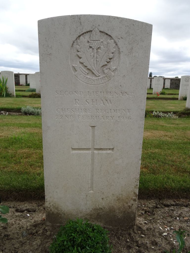 22/02/1916 Second Lieutenant Rowan Shaw 9th Bn. Pont-Du-Hem Military Cemetery, La Gorgue, France. I. D. 5.