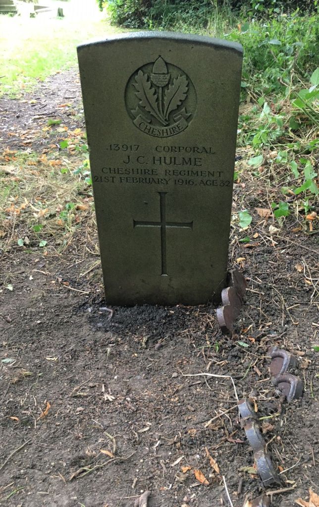 21/02/1916 Corporal John Charles Hulme (Age 32) Depot Glossop (Or Whitfield) (St. James) Churchyard, United Kingdom. ‘13917’ In North-East part of Extension. Husband of Elizabeth Hulme, of 32, Edward St., Glossop. (pic from findagrave.com – with thanks)