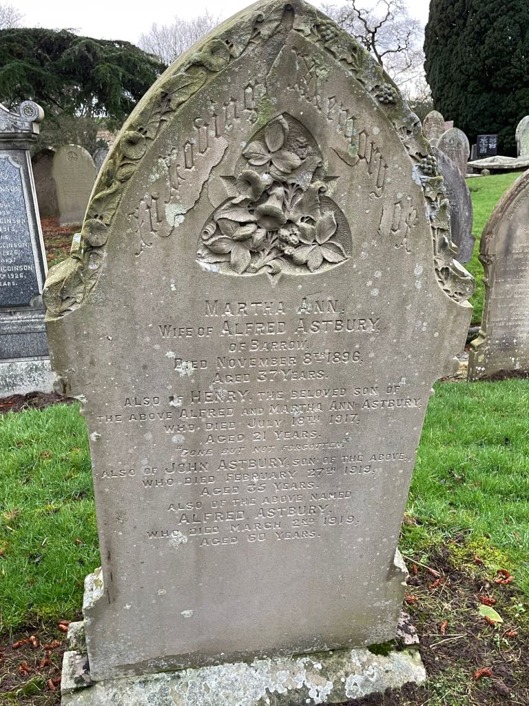 27/02/1919 Private John Astbury (Age 35) depot 59696′ Barrow (St. Bartholomew) Churchyard Cheshire United Kingdom. Son of the late Alfred and Martha Astbury, of Broomhill, Barrow, Cheshire.