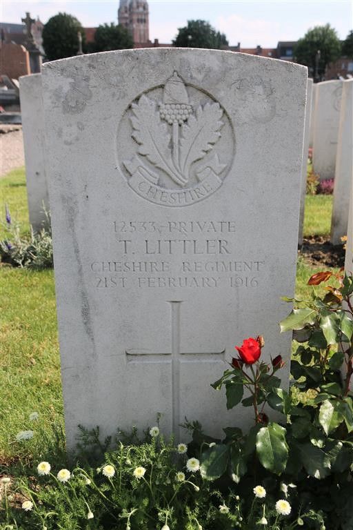 21/02/1916 Private Thomas Littler (Age 30) 9th Bn. Merville Communal Cemetery, France. ‘12533’ VI. L. 2. Son of Thomas and Katherine Littler, of Chester; husband of Eliza Ann Titman (formerly Littler), of 4, Davies Buildings, King St., Chester. (pic from findagrave.com – with thanks)