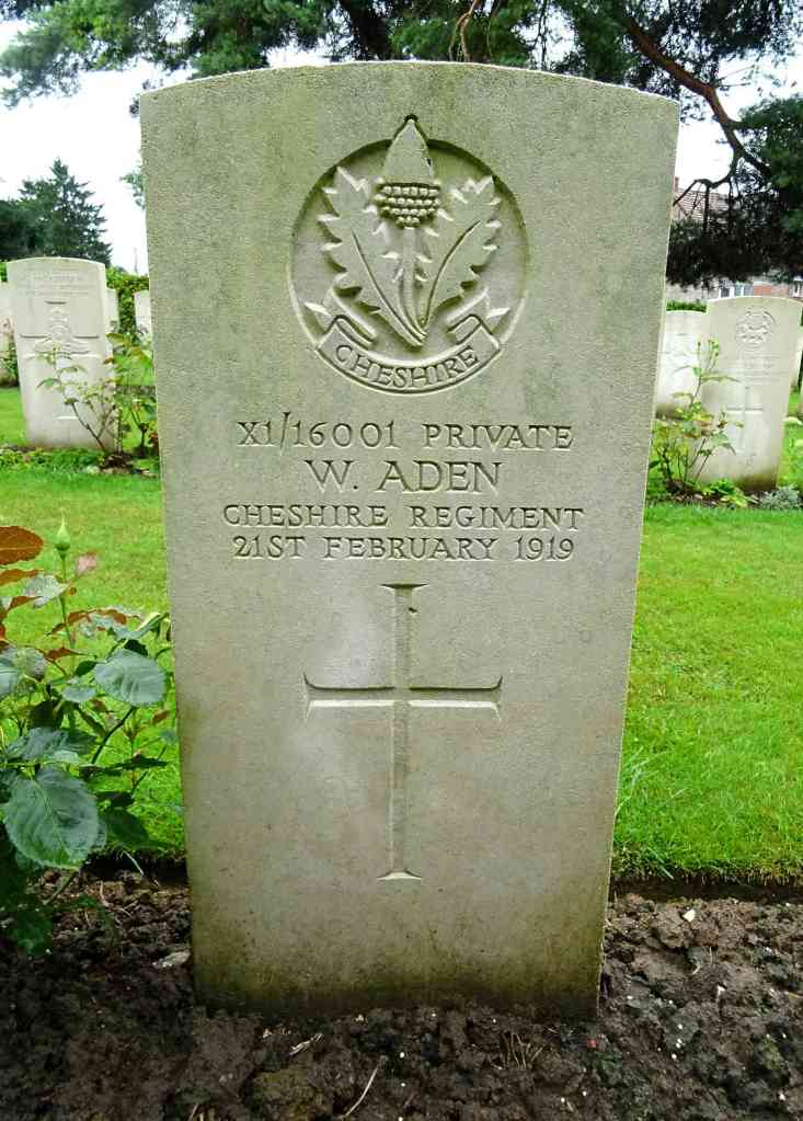 21/02/1919 Private Wilfred Aden 11th Bn. Le Quesnoy Communal Cemetery Extension, France. ‘XI/16001’ I. D. 9. (pic from findagrave.com – with thanks)