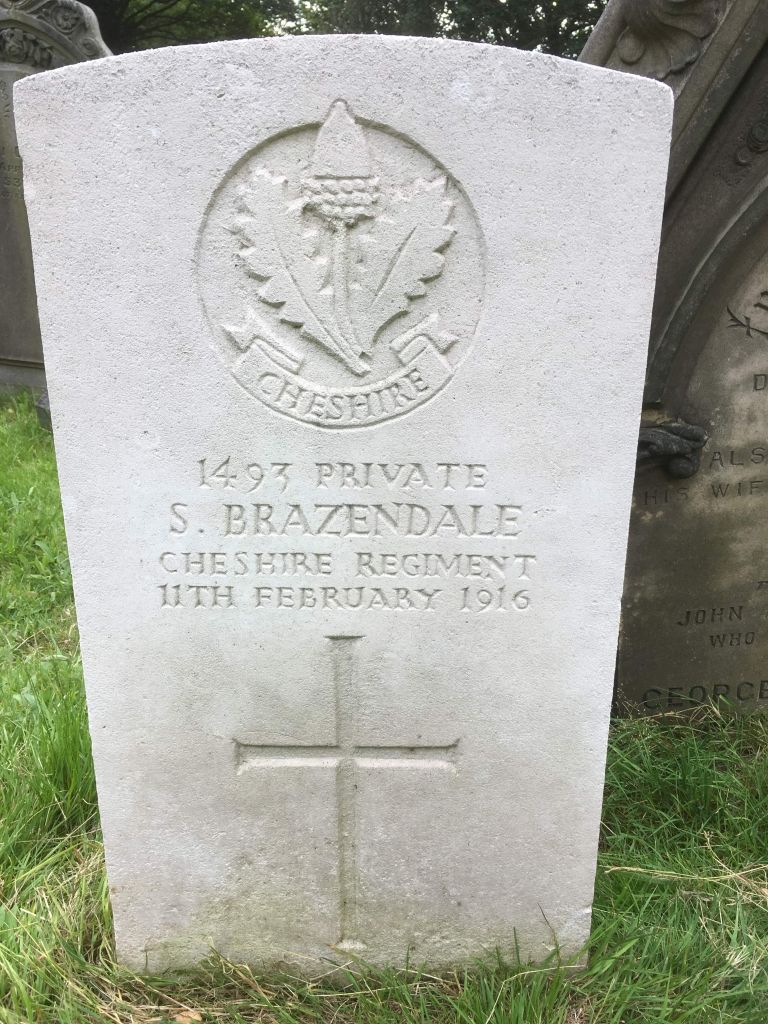 11/02/1916 Private Stanley Brazendale 5th Bn. Lymm (St. Mary) Churchyard, United Kingdom. ‘1493’ West of Church. (pic from findagrave.com – with thanks)