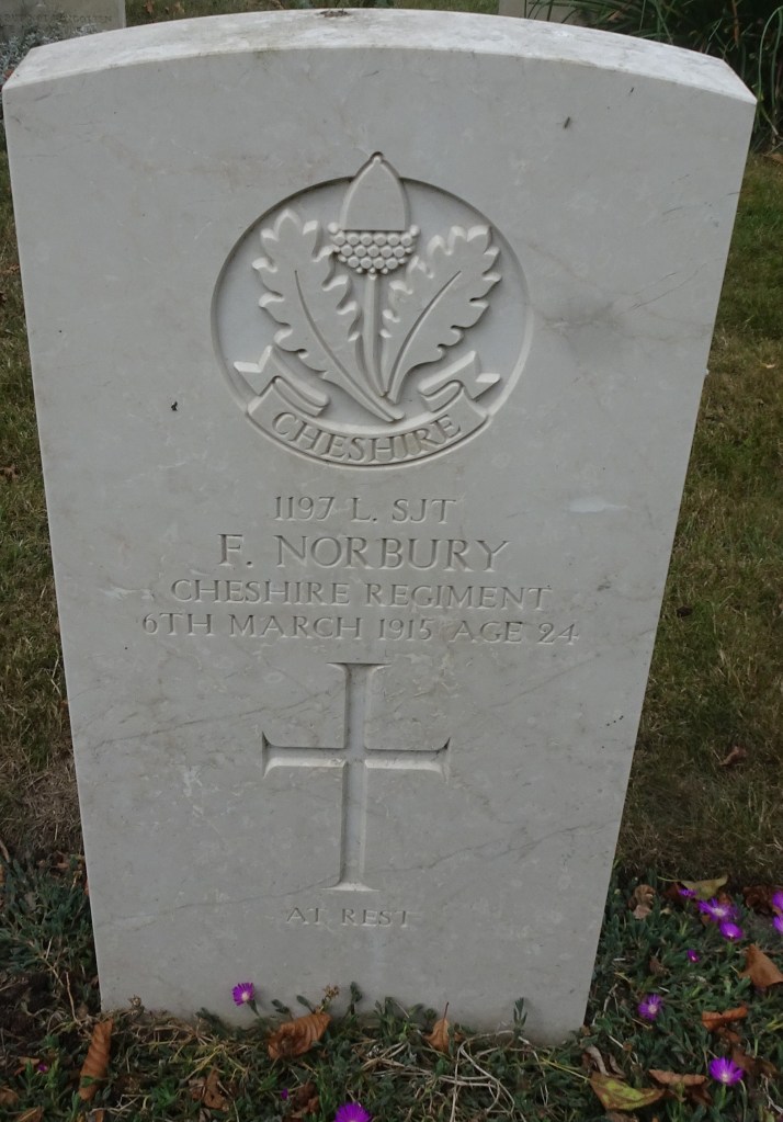 6/03/1915 Lance Serjeant Frank Norbury (Age 24) 1st/5th Bn. Ration Farm (La Plus Douve) Annexe, Belgium. ‘1197’ I. A. 2. Son of Charlotte M. Graves (formerly Norbury), of 158, Edleston Rd., Crewe, Cheshire, and the late George Fredrick Norbury. Native of Stretford, Manchester.
