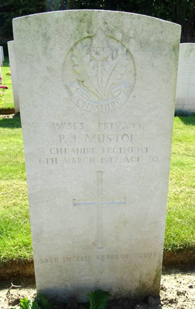 6/03/1917 Private Philip Joseph Mustoe (Age 20) No. 2 Coy. 13th Bn. Cambrin Military Cemetery, France. ‘W/553’ H. 18. Son of Philip John and Elizabeth Mustoe, of 27, Napier Rd., New Ferry, Birkenhead. Native of Bromborough, Cheshire. (pic from findagrave.com – with thanks)