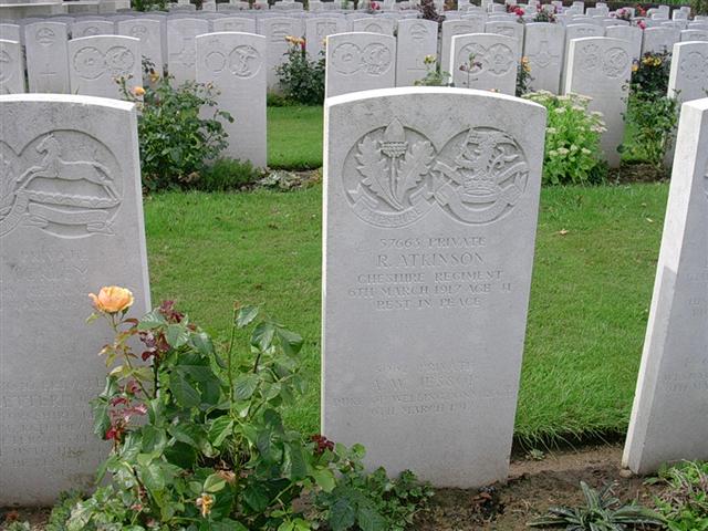 6/03/1917 Private Richard Atkinson (Age 41) 20th Bn. Varennes Military Cemetery, France. ‘57563’ I. I. 77. Husband of Sarah Ann Atkinson, of 19, Heys St., Haslingden, Lancs. (pic from findagrave.com – with thanks)