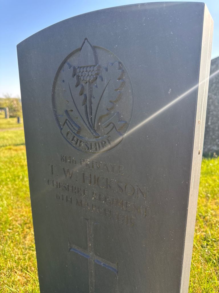 6/03/1915 Private Thomas William Hickson 2nd Bn. Tredegar (Cefn Golau) Cemetery, United Kingdom. ‘8146’ IV. 13. 318. (pic from findagrave.com – with thanks)