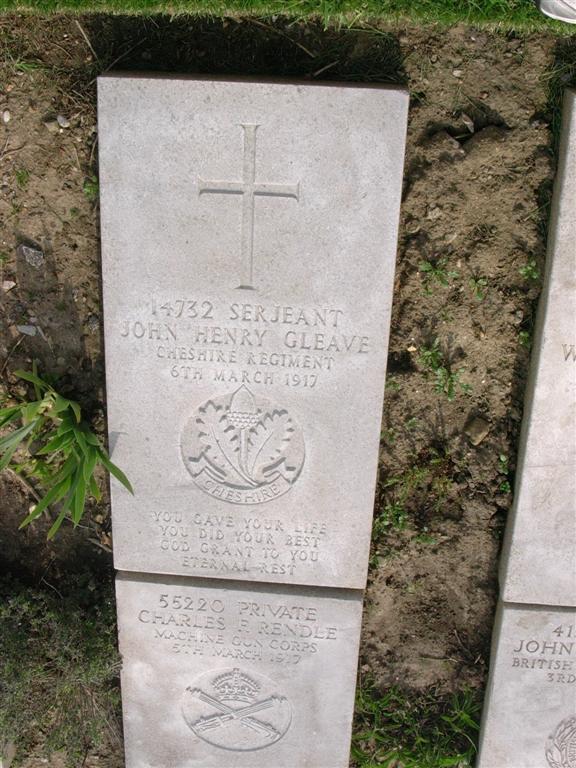 6/03/1917 Serjeant John Henry Gleave (Age 24) 10th Bn. Boulogne Eastern Cemetery, France. ‘14732’ VIII. A. 196. Son of John and Mary Ellen Gleave, of 42, Lostock Green, Northwich, Cheshire. (pic from findagrave.com – with thanks)