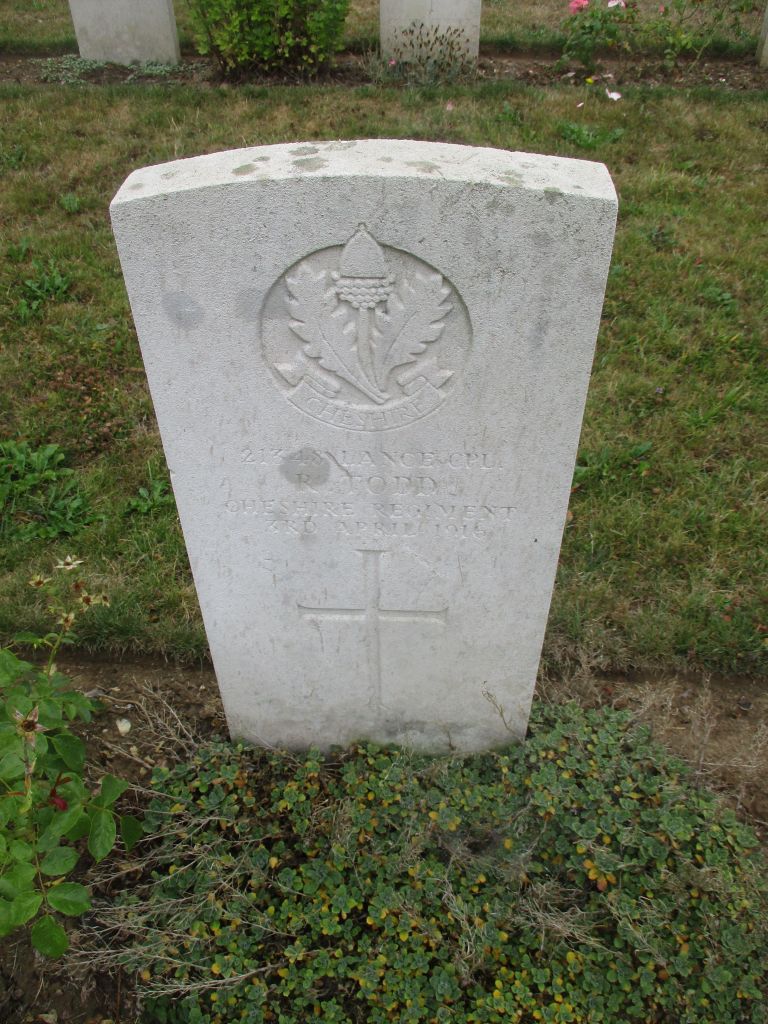 3/04/1916 Lance Corporal Robert George Perrie Todd 16th Bn. Royal Irish Rifles Graveyard, Laventie, Pas de Calais France. ‘21348’ II. D. 7. Husband of M. Todd, of 2, Bridge Place, Alva, Clackmannanshire. (pic from findagrave.com – with thanks)