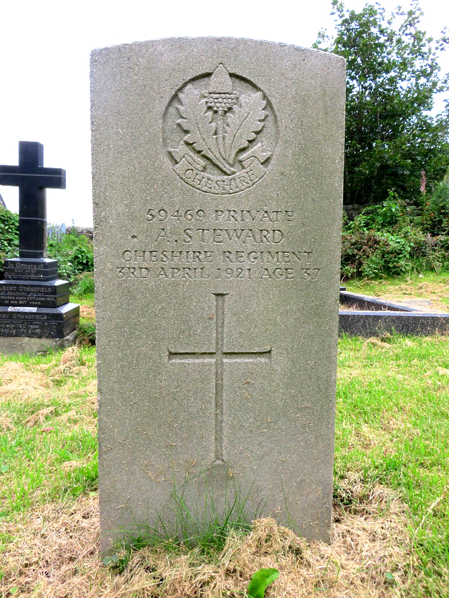 3/04/1921 Private Albert Steward (Age 37) “B” Coy. 8th Bn. Holme-In-Cliviger (St. John) Churchyard, Lancashire United Kingdom. ‘59469’ Near West boundary. Son of Benjamin and Elizabeth Steward, of Cowlinge, Suffolk; husband of Annie Steward, of 6, Christie St., Stockport, Cheshire. (pic from findagrave.com – with thanks)