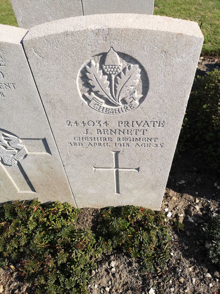 3/04/1918 Private John Bennett (Age 25) 11th Bn. St. Sever Cemetery Extension, Rouen, Seine-Maritime France. ‘244034’ P. VII. I. 3B. Son of Mary Bennett, of Poulton, Wallasey, Cheshire, and the late Samuel Bennett; husband of Janet Lloyd (formerly Bennett), of 13, Lower Rd., Coedpoeth, Wrexham, Denbighshire. (pic from findagrave.com – with thanks)