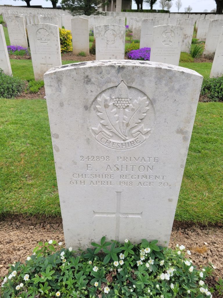 6/04/1918 Private Ellis Ashton (Age 20) 11th Bn. Cabaret-Rouge British Cemetery, Souchez, Pas de Calais France. ‘242898’ XVI. F. 4. Son of George and Elizabeth Ann Ashton, of Bridge End, Billington, Whalley, Blackburn.