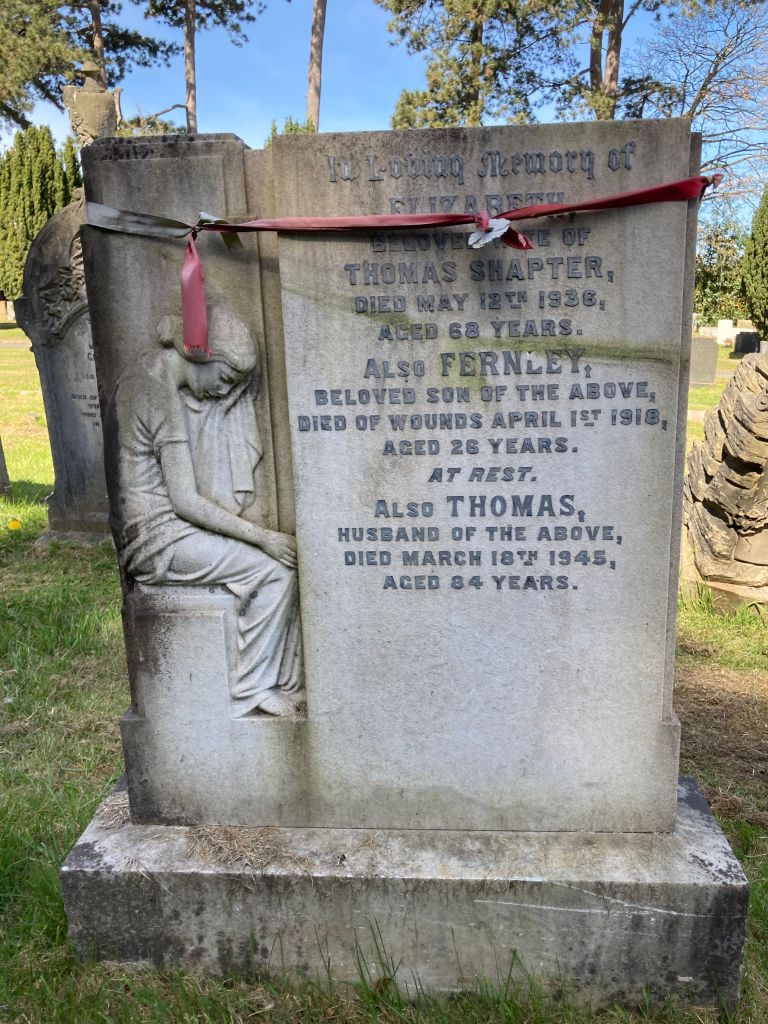 6/04/1918 Private Fernley Shapter (Age 26) 6th Bn. (formerly 3rd Bn.) Bebington Cemetery, Cheshire United Kingdom. ‘3/62017’ D. N.C. 673. Son of Thomas Shapter, of 80, Grasville Rd., Tranmere, Birkenhead, and the late Louisa Shapter.