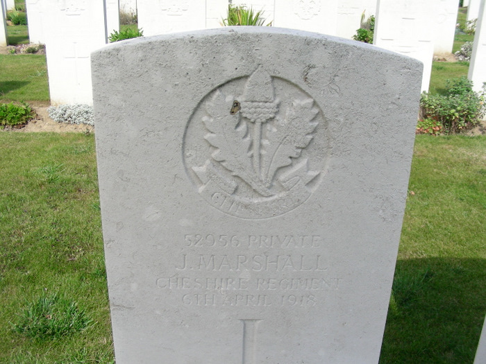 6/04/1918 Private John Marshall 10th Bn. Pont-D’achelles Military Cemetery, Nieppe, Nord France. ‘52956’ II. G. 6. Husband of Mrs. E. C. Marshall, of 43, Short St., Heaton Norris, Stockport.