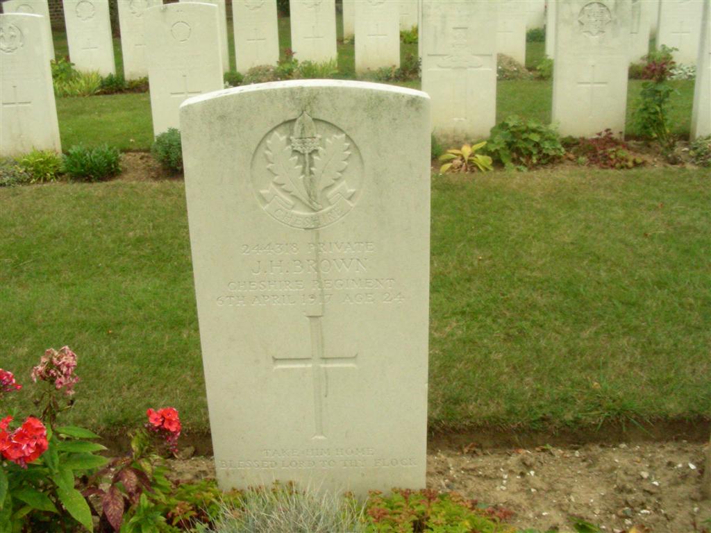 6/04/1917 Private Joseph Henry Brown (Age 24) 1st/5th Bn. Achicourt Road Cemetery, Achicourt, Pas de Calais France. ‘244318’ B. 12. Son of Mrs. E. H. Naylor (formerly Brown), of 9, Hope Rd., Sale, Cheshire, and the late John Brown. Native of Altrincham.