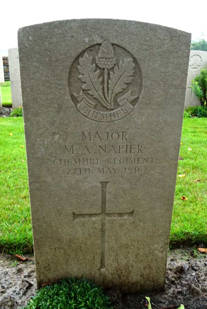 27/05/1916 Major Maurice Alexander Napier (Age 29) Rue-Du-Bacquerot (13th London) Graveyard, Laventie, Pas de Calais France. Son of Arundel Berkeley Napier and Celia Jane Napier, of 26, St. James Square, Bath. (pic findagrave.com – with thanks)