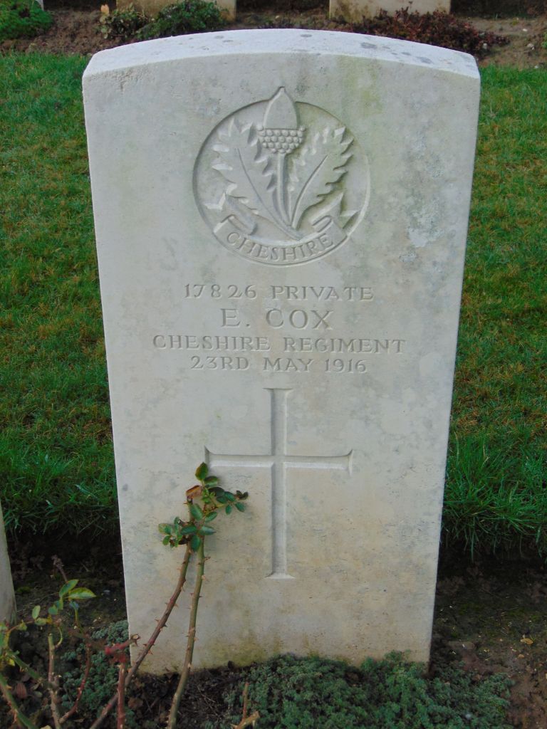 30/05/1916 Private Edward Southern (Age 30) 13th B Etaples Military Cemetery, Pas de Calais France. ‘24001’ Son of James and Sarah A. Southern; husband of Ethel H. Southern, of 53, Lime St., Ellesmere Port, Cheshire.