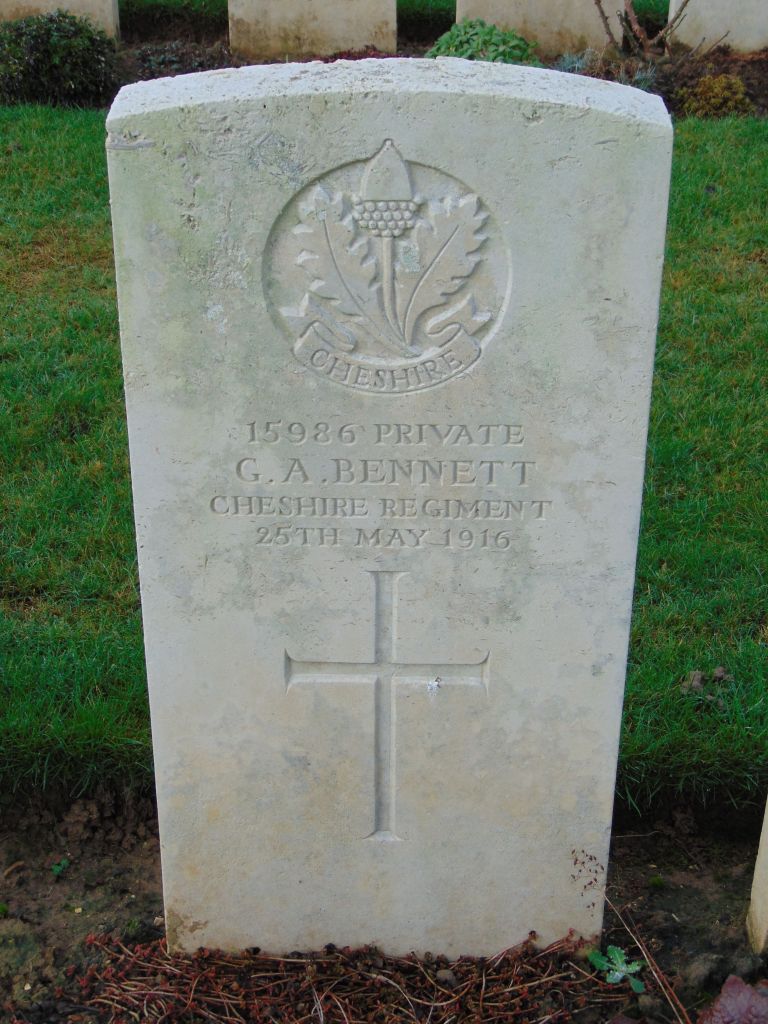 25/05/1916 Private George Arthur Bennett 10th Bn. Aubigny Communal Cemetery Extension, Pas de Calais France. ‘15986’ (pic findagrave.com – with thanks)