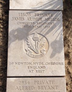 29/05/1915 Private James Arthur Mellor 2nd Bn. Boulogne Eastern Cemetery, Pas de Calais France. ‘12505’ Husband of Mary Ann Mellor, of 6, Ashton Rd., Newton Hyde, Cheshire. (pic findagrave.com – with thanks)