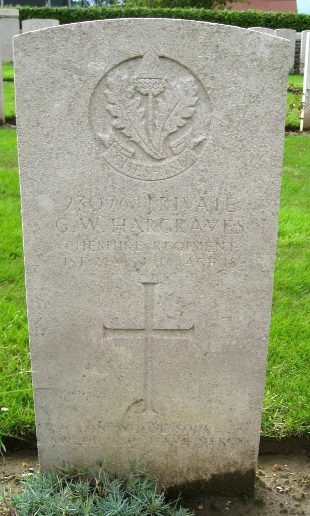 1/05/1916 Private George William Hargraves (Age 18) 15th Bn. Rue-Des-Berceaux Military Cemetery, Richebourg-L’avoue, Pas de Calais France. ‘23076’ Son of Harry and Agnes Hargraves, of 80, Wellington St., Ashton-under-Lyne, Lancs. (pic findagrave.com – with thanks)