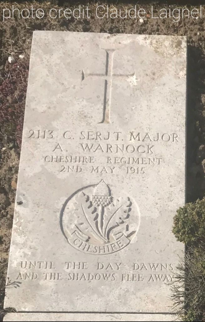 2/05/1915 Company Serjeant Major Alexander Warnock (Age 41) 5th Bn. Wimereux Communal Cemetery, Pas de Calais France. ‘2113’ Son of John and Rachel Warnock, of Birkenhead; husband of Lillian A. Warnock, of 7, Lancashire St., Newton Heath, Manchester. (pic findagrave.com, specifically Claude Laignel – with thanks)