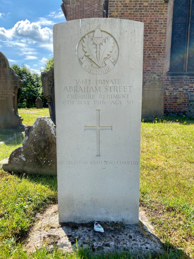 6/05/1916 Private Abraham Street (Age 30) Chelford (St. John) Churchyard, Cheshire United Kingdom. ‘36183’ Son of William and Emma Street, of Church Cottages, Chelford, Cheshire. East of Church. (pic findagrave.com – with thanks)