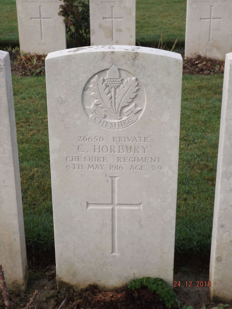 6/05/1916 Private Charles Horbury (Age 29) 10th Bn. Aubigny Communal Cemetery Extension, Pas de Calais France. ‘26650’ Son of James Henry and Mary Horbury, of 35, Church St., Heaton Norris, Stockport. (pic findagrave.com – with thanks)