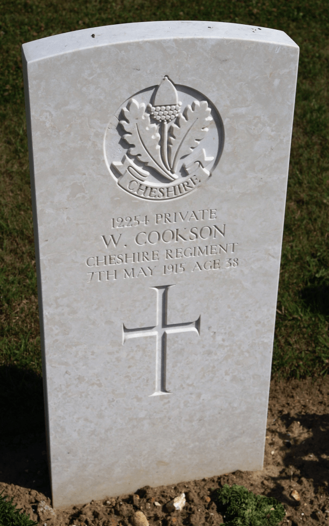 7/05/1915 Private William Cookson (Age 38) 1st Bn. Le Treport Military Cemetery, Seine-Maritime France. ‘12254’ Son of William and Sarah Arm Cookson, of Manchester and Shrewsbury. (pic findagrave.com – with thanks)