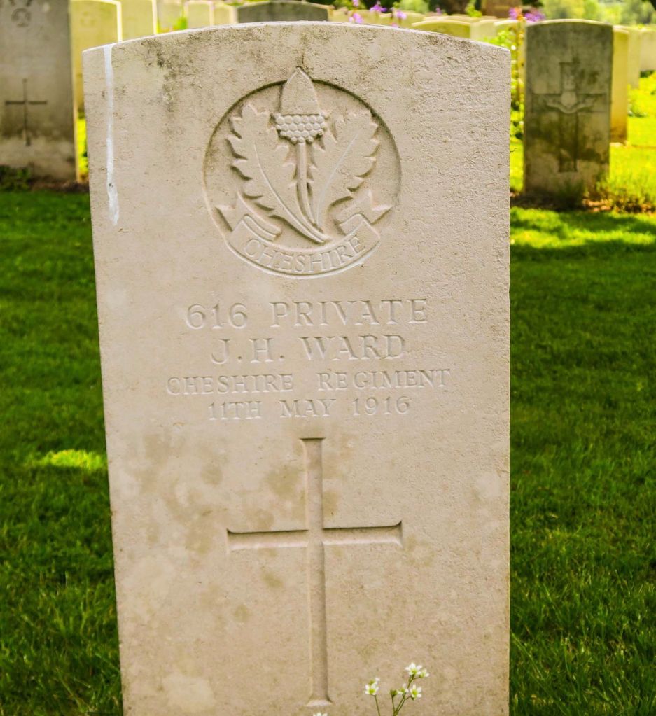 11/05/1916 Private James Henry Ward (Age 26) 13th Bn. Ecoivres Military Cemetery, Mont-St. Eloi, Pas de Calais France. ‘616’ Son of Hugh and Annie Ward, of County Armagh, Ireland. (pic findagrave.com – with thanks)