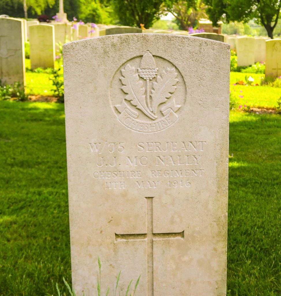 11/05/1916 Serjeant James Joseph McNally 13th Bn. Ecoivres Military Cemetery, Mont-St. Eloi, Pas de Calais France. ‘W/75’ (pic findagrave.com – with thanks)