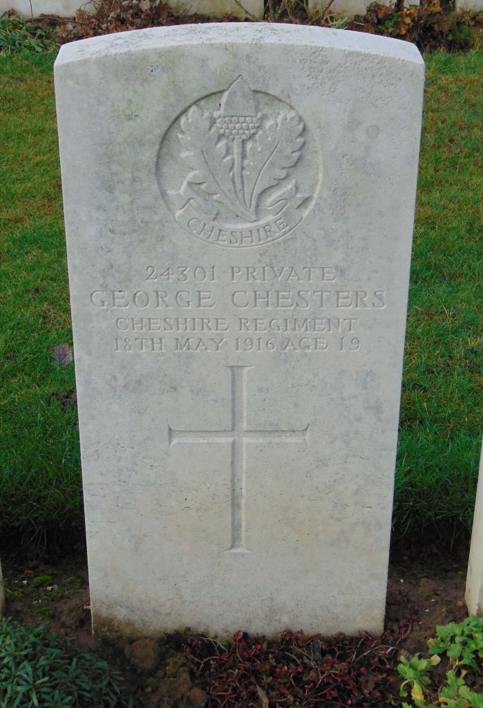 18/05/1916 Private George Chesters (Age 19) 11th Bn. Aubigny Communal Cemetery Extension, Pas de Calais France. ‘23401’ Son of Alfred and Mary Chesters, of Red Hill Cottages, Tarporley, Cheshire. (pic findagrave.com – with thanks)