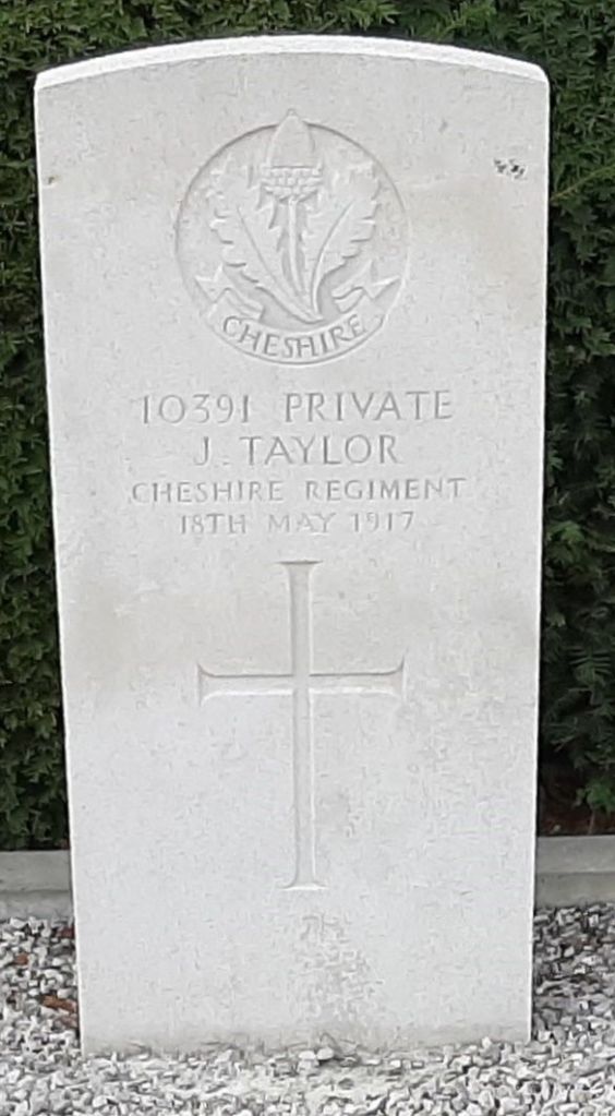 18/05/1917 Private John Taylor 13th Bn. Bousbecque Communal Cemetery, Nord France. ‘10391’ (pic findagrave.com – with thanks)