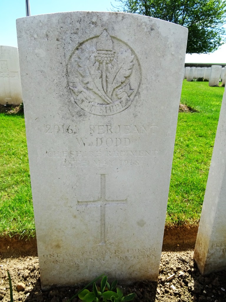 18/05/1918 Serjeant William Dodd (Age 42) 13th Bn. Crouy British Cemetery, Crouy-Sur-Somme, Somme France. ‘29161’ Son of John and Mary Dodd, of Pendleton, Manchester. Served in the South African Campaign. (pic findagrave.com – with thanks)