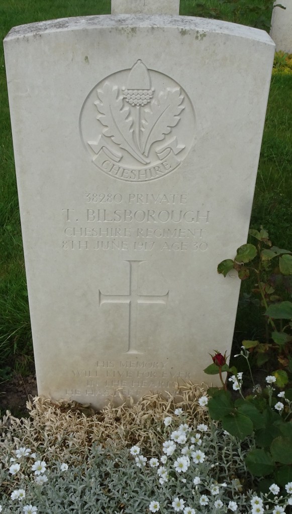 8/06/1917 Private Thomas Bilsborough (Age 30) 19th Bn. Ferme-Olivier Cemetery, West-Vlaanderen Belgium. ‘38280’ Son of the late James and Harriet Agnes Bilsborough, of 2, Harridge Cottages, Healey, Rochdale.