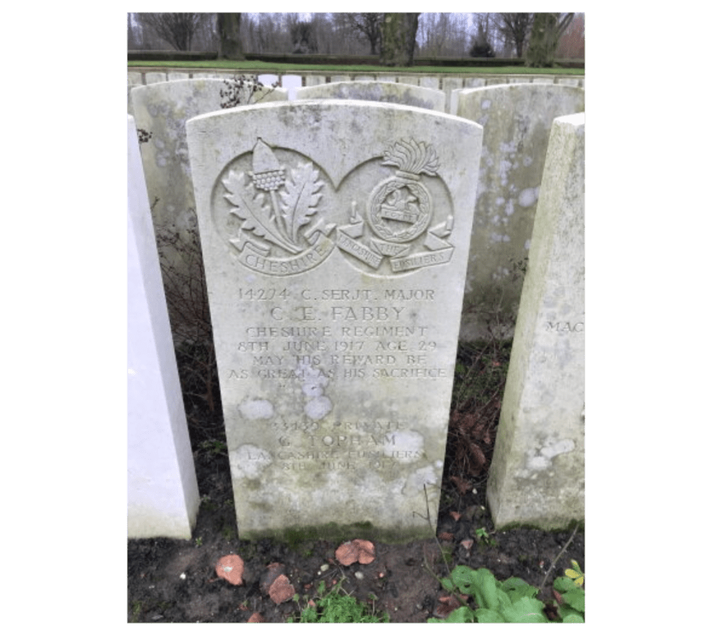 8/06/1917 Company Serjeant Major Charles Evan Fabby (Age 29) MID 11th Bn Bailleul Communal Cemetery Extension, Nord, Nord France. ‘14274’ Husband of Lily Fabby, of 59, Queen’s St., West Gorton, Manchester. (pic from findagrave.com – with thanks)