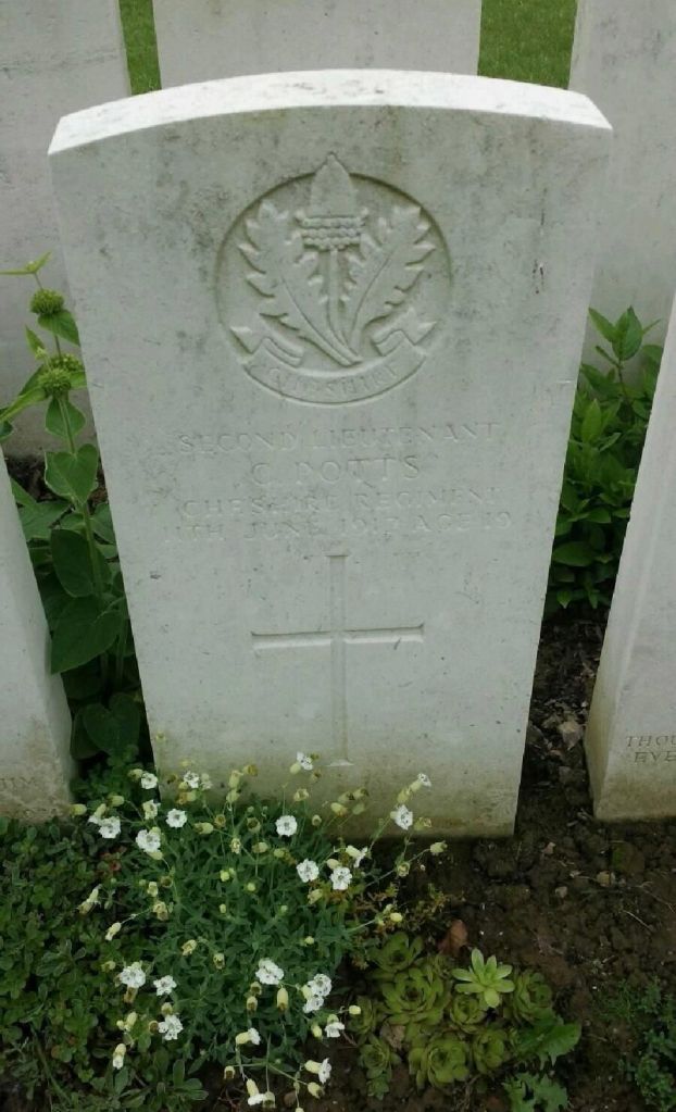 11/06/1917 Second Lieutenant Charles Potts (Age 19) 4th Bn. attd. 11th Bn. Bailleul Communal Cemetery Extension, Nord, Nord France. Son of Hubert and Rosa Potts, of Netherleigh, Chester. (pic from findagrave.com – with thanks)