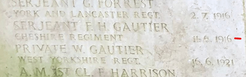 11/06/1916 Serjeant Francis Herbert Gautier (Age 44) 11th Bn. Sheffield General Cemetery, Yorkshire United Kingdom. ‘10885’ Husband of Edna Gautier, of 34, Tapton Bank, Manchester Rd., Sheffield. His sons Wilfred Gautier and Francis Herbert Gautier also fell. (pic from findagrave.com – with thanks)