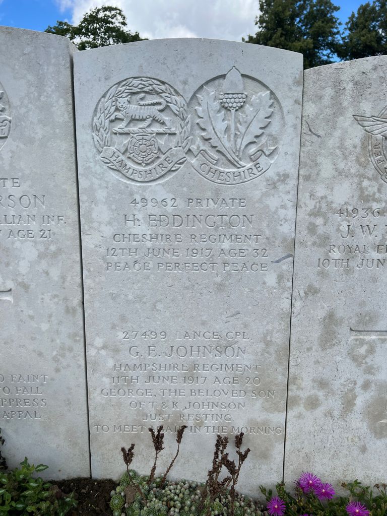 12/06/1917 Private Harold Eddington (Age 32) 13th Bn. Longuenesse (St. Omer) Souvenir Cemetery, Pas de Calais France. ‘49962’ Son of Jane Ann Eddington, of 115, Victoria Rd., New Brighton, Wallasey, and the late Charles Eddington. (pic from findagrave.com – with thanks)