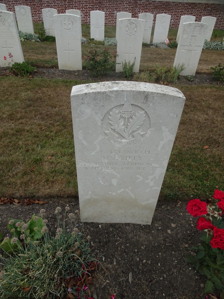 16/06/1915 Lance Corporal Maurice James Riley (Age 31) 2nd Bn. La Clytte Military Cemetery, West-Vlaanderen Belgium. ‘24793’ Son of Maurice James and Ann Riley, of 46, Manchester St., Crewe, Cheshire. Served in the South African Campaign.