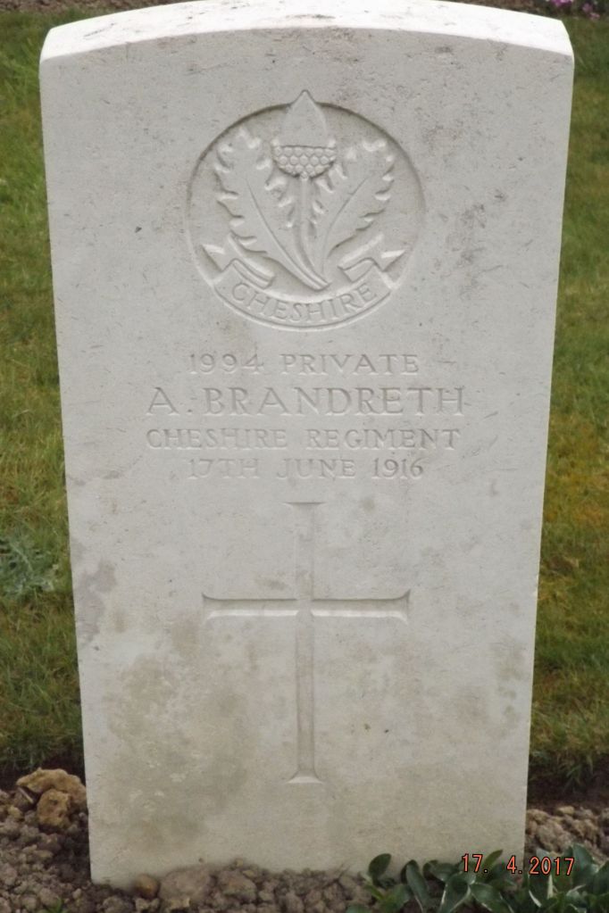 17/06/1916 Private Albert Brandreth 1st/5th Bn. Hebuterne Military Cemetery, Pas de Calais France. ‘1994’ (pic findagrave.com – with thanks)
