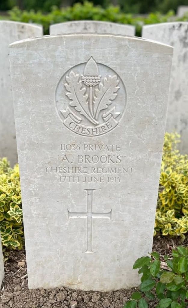 17/06/1915 Private Allen Brooks 1st Bn. Bailleul Communal Cemetery Extension, Nord, Nord France. ‘11036’ (pic findagrave.com – with thanks)
