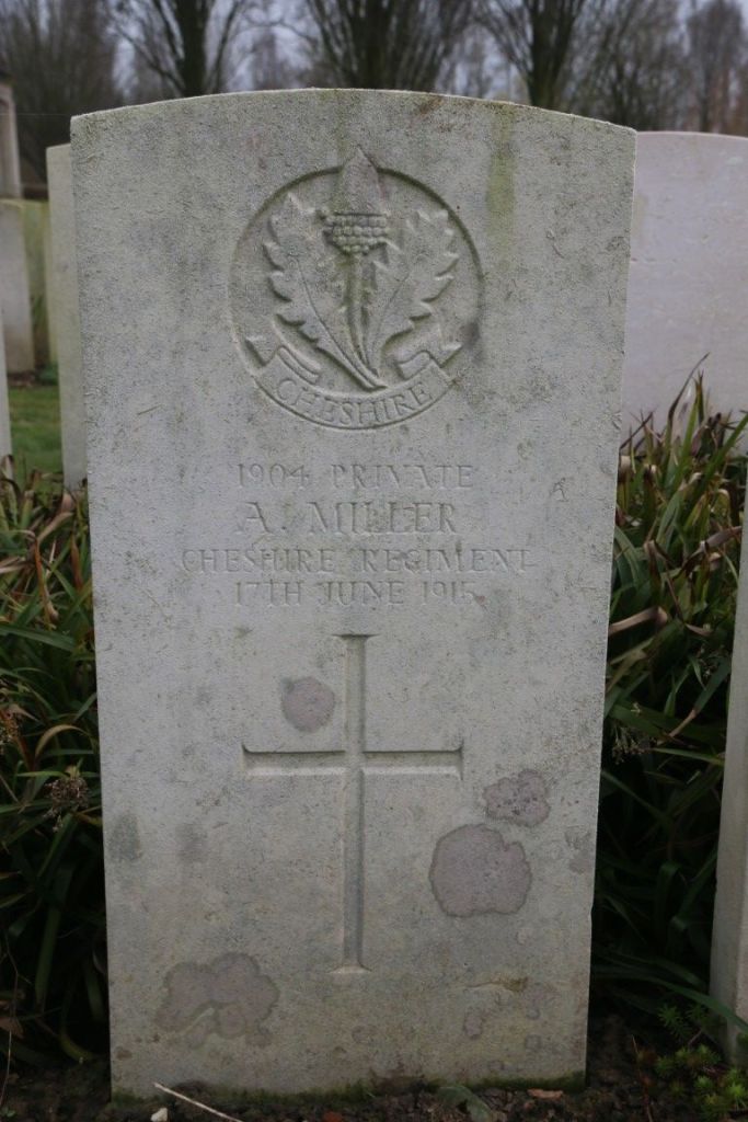 17/06/1915 Private Albert Miller (Age 21) 5th Bn. Bailleul Communal Cemetery Extension, Nord, Nord France. ‘1904’ Son of Joseph Miller, of 24, Arthur St., Runcorn, Cheshire. (pic findagrave.com – with thanks)