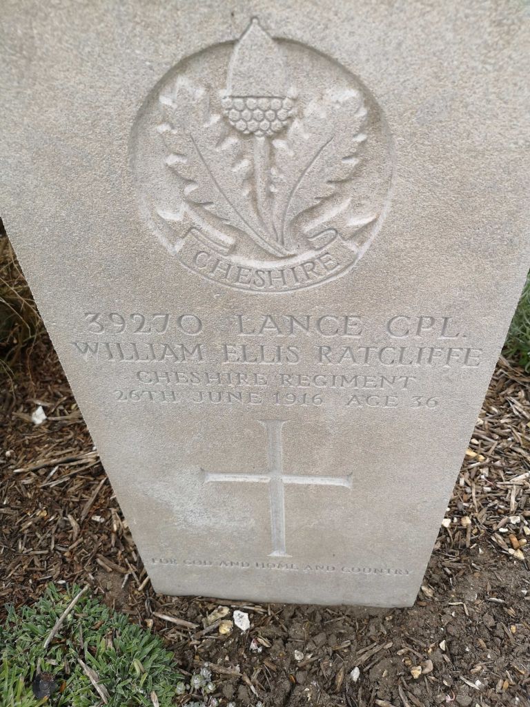 26/06/1916 Lance Corporal William Ellis Ratcliffe (Age 36) 19th Bn. St. Sever Cemetery, Rouen, Seine-Maritime France. ‘39270’ Son of John and Betty Ratcliffe, of 3, Warwick St., Haslingden; husband of Elizabeth H. Ratcliffe, of 12, Manchester Rd., Haslingden, Lancs. (pic from findagrave.com – with thanks)