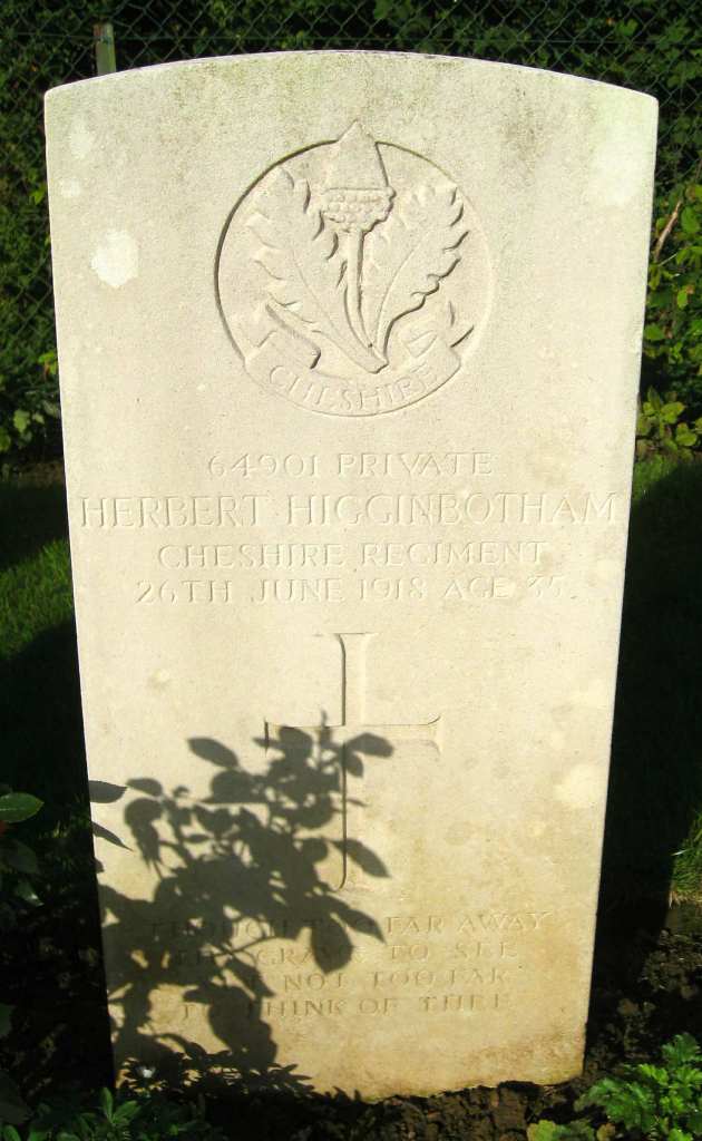 26/06/1918 Private Herbert Higginbotham (Age 35) 1st Bn. Aval Wood Military Cemetery, Vieux-Berquin, Nord France. ‘64901’ Son of John and Maria Higginbotham, of Stockport; husband of Charlotte Blackshaw Higginbotham, of 17, George St., West Hall St., Stockport. (pic from findagrave.com – with thanks)