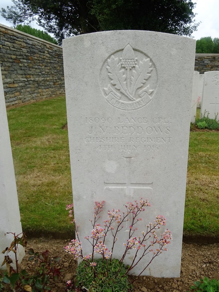 4/07/1916 Lance Corporal Jabez Vincent Beddows 9th Bn. Cerisy-Gailly French National Cemetery, Somme France. ‘18090’ (pic from findagrave.com – with thanks)